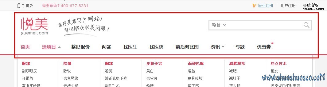 導航到底是怎麼去設計,是可以根據自己的評測去進行嗎?如果你根據這個去設計,我只能說你的用戶會離開你。我在《網絡營銷策劃,算個球啊》 中詳細對於怎樣考慮需求去進行網站營銷策劃大致的說明了一下。其實網站導航設計也是離不開用戶的需求。怎麼去做呢?你可以參考一下百度相關搜索關鍵詞去進 行布局。比如說,整形。你到百度搜索這個關鍵詞你會發現百度首頁出現了什麼。是不是出現了百度知道、醫院、以及一些與整形相關的項目。出現百度知道說明用 戶有問答的需求。其他兩個也是我們需要去挖掘的。這樣你看看悅美網的布局也就感覺是非常合理的了。