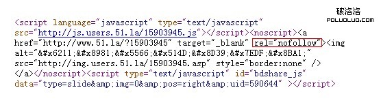 每個網站都會安裝一些第三方的統計工具以便以網站的運營,這樣的統計工具都屬於站外鏈接,而且是屬於全站的站外鏈接,這樣容易造成網站本身的權重流失。所以有必要加上nofollow標識,避免本身網站的權重流失,而且這也不會影響統計工具的使用,下圖以51統計為例,其它的統計工具也是一樣的方法,主要運用於HTML的中,新手站長朋友可以照葫蘆畫瓢。