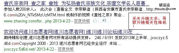 外鏈可以說是網站優化的一個永恆的話題,即使現在的百度算法一再強調網站排名與外鏈的多少無關,但是不少站長還是願意重復地發著外鏈,這也意味著外鏈的作用依然存在,只是被弱化了而已。但是,當我們辛辛苦苦發了無數外鏈並被收錄後,卻依然發現網站無法獲得首頁排名,如下面網站一樣: