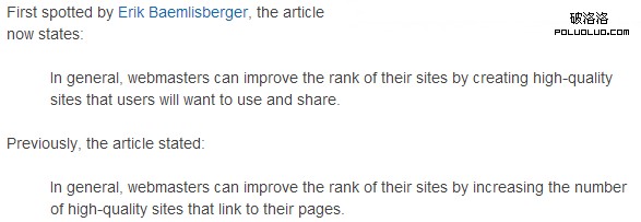 Google排名的新思想似乎某種程度上“鼓勵”了這種做法。在過去,Google的排名算法思想中很明確地提到了要注意“links”,而現在“links”似乎不再那麼直白的被提及。Erik Baemlisberger,SEO界的知名專家,最先注意到Google的這種改變,在Google的Ranking Help文章中,有這樣的表述:“In general, webmasters can improve the rank of their sites by creating high-quality sites that users will want to use and share. (總體上,用戶喜聞樂見和樂於分享的高質量網站能夠在排名上有更好表現)”。而過去,同樣的這個文章的表述是:“In general, webmasters can improve the rank of their sites by increasing the number of high-quality sites that link to their pages. (總體上,為自己的網站帶來更多高質量網站的鏈接,能夠增進排名)”。二者的變化顯而易見,如下圖所示:
