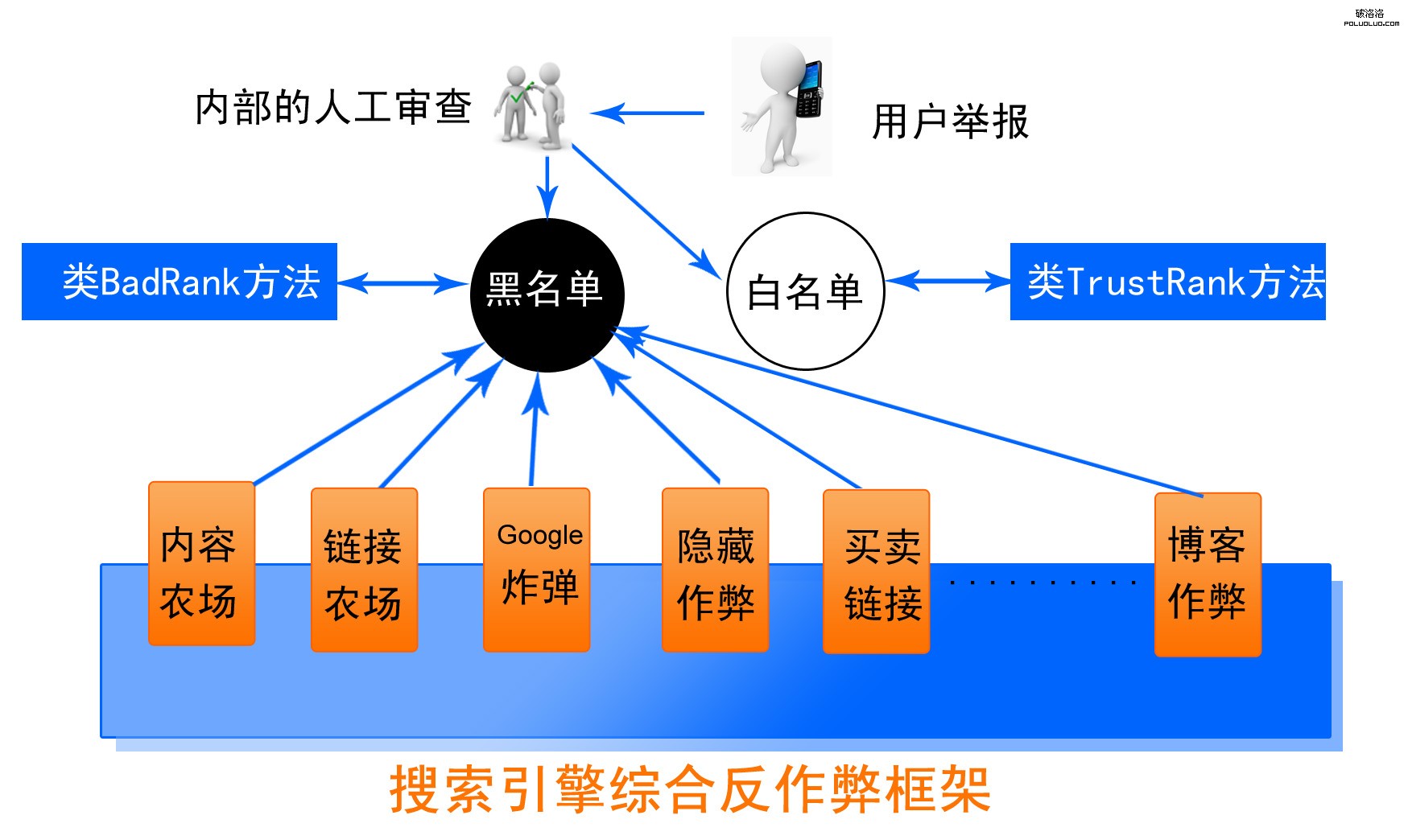 通用的反作弊方法大體有兩類,一種類似於BadRank的思路,即從黑名單出發根據鏈接關系探尋哪些是有問題的網頁;另一種類似於TrustRank的思路,即從白名單出發根據鏈接關系排除掉那些沒有問題的網頁。兩者顯然有互初的關系,通過兩者搭配可以形成有效的反作弊屏障。這種通用方法的好處是具有預防性,哪怕是新出現的作弊方式,只要作弊網頁需要通過鏈接關系進行操縱,那麼通用方法就能在一定程度上起到作用。但是正是因為通用方法的通用性,所以其反作弊思路沒有針對性,對於一些特殊的作弊手段無法有效的發現。此時,針對特殊作弊手段的方法形成了三道屏障,即搜索引擎公司針對具體作弊方法采取專用技術手段來進行識別,因為有針對性所以效果較好,但是缺點在於一類反作弊方法只能識別專門的作弊手段,對於新出現的作弊方法往往是無能為力的。就比如綠蘿算法,就是針對型的技術。他針對的就是買賣鏈接的網站。而且在時間上往往滯後後作弊現象。也就是說,已經有了這項作弊手法,之後才針對這項作弊方法而推出的反作弊手法。