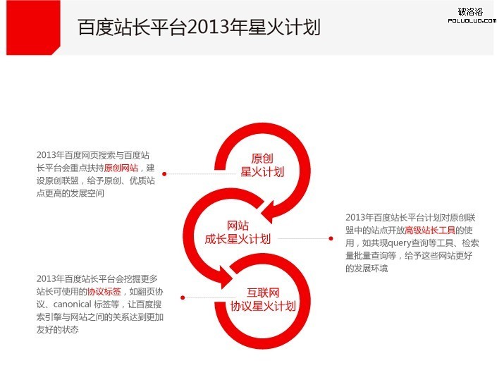 報告裡還提到百度站長平台2013火星計劃。隨著百度站長平台的推出,感覺百度官方和草根站長的距離是越來越近了。看這火星計劃,有很多利於發展優質網站的政策,希望百度站長平台能夠真正落實這些政策,讓一些用心做網站的草根站長能夠受益。