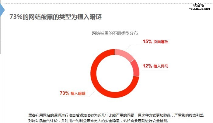 對以這個我同樣感受最深,自己的幾個網站都有被黑的經歷。其中幾個沒怎麼管的小網站,因為是隨便租的國外空間,漏洞補丁也不及時,出現安全問題更是習以為常。而在國內,像這樣沒安全意識的小網站特別多。因此也給了很多黑客機會,特別是黑鏈的泛濫,很多小網站都難逃被掛黑鏈的命運。比如報告中就提到,有73%的網站被黑,都是因為植入暗鏈。而容易被植入暗鏈的,都是站長不怎麼重視的小站。因為平時也不管理,被黑了也不會注意到。