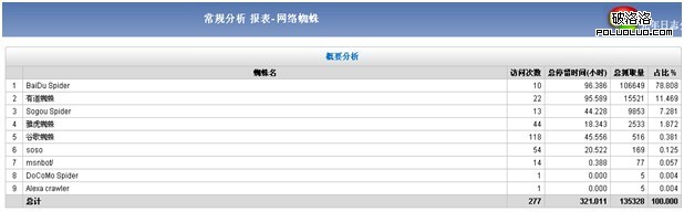 借助光年日志分析工具,獲取各個搜索引擎的蜘蛛總抓取量、蜘蛛總停留時間、蜘蛛來訪次數(本人由於只做百度優化,就說說百度蜘蛛抓取情況),如下圖1: