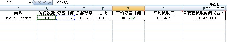 單頁面抓取時間==停留時間*3600/總抓取量 計算公式:=D2/C2 enter鍵