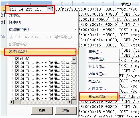 點擊IP段下拉框,找到文本篩選,選擇自定義篩選。