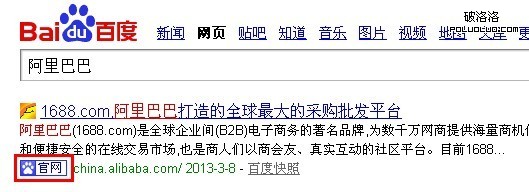 最近一段時間一直在關注百度變化,今天早晨博主在搜索阿裡巴巴網站時,發現百度又出來一個新的標識—官網標志。以前從其他的博主的博客上了解到,百度對於serp“官網標志”,還處在測試中,但從目前情況來看,百度測試階段應該已經完成,並且已經正式開始投入使用。