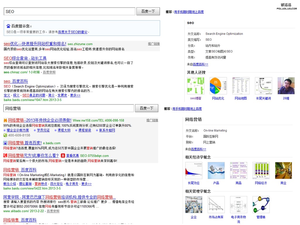筆者最近在百度中搜索相關關鍵詞的時候,發現某些指數高的關鍵詞增加了右側欄,原來右欄的廣告位置下移。這個右側欄的內容主要包含4個方面的內容: