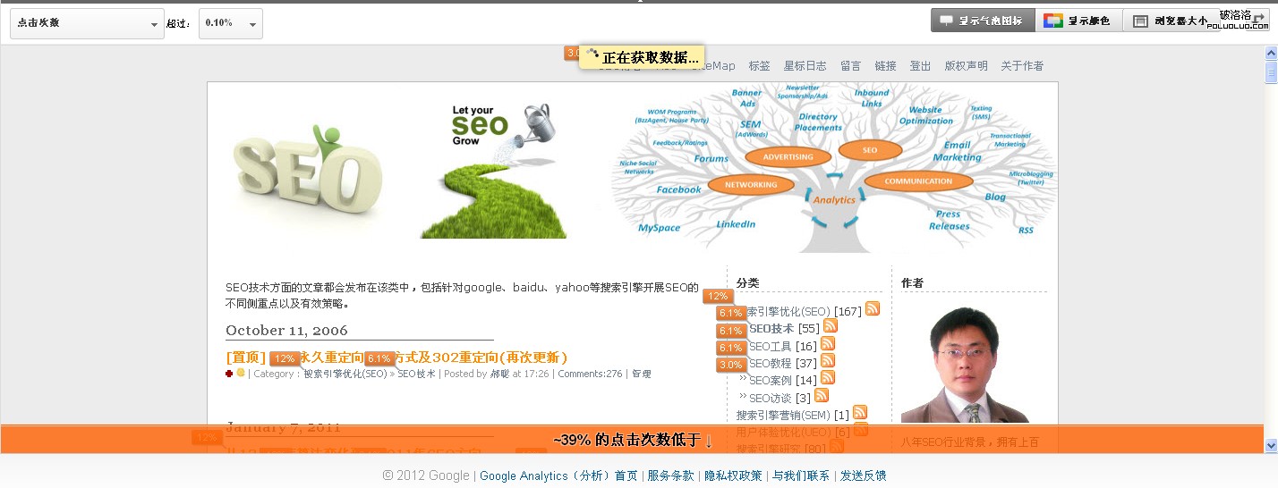 通過Google Analytics的”網頁內分析“,可以得知網站用戶真實的點擊行為、最感興趣的內容、超鏈接點擊比例等數據,以便後續根據用戶點擊行為來進行頁面細節優化與調整。接下來,以我的SEO博客為例,通過Google Analytics網頁內分析功能,分析如何進行SEO與UEO。