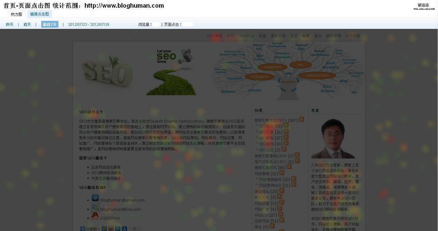 其實,要想徹底的優化博客首頁用戶體驗,還應該從更多角度來分析,比如:如何通過首頁提高注冊率、優質的舊文章如何得到更多展示。限於篇幅不再細致化分析,順便上傳一張百度的百度的熱點圖與鏈接點擊圖,可以與Google Analytics的網頁內分析做個對比: