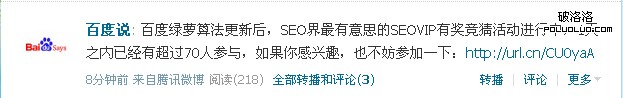 第三點是百度已經關注到了,我看到有獎競猜:SEOVIP的排名會回來嗎?這條消息是在百度說的騰訊微博上看到的,這說明百度已經關注到了