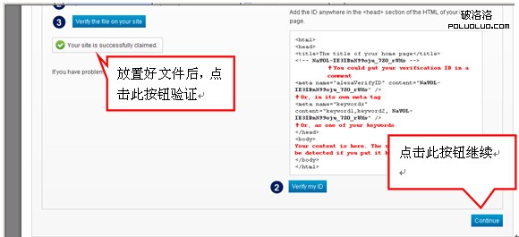 輸入後點擊【Continue】繼續按鈕,進入網站所有權驗證頁面,如下圖