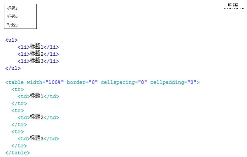 1、簡化代碼結構,更利於搜索引擎分析抓取有用內容:頁面盡量采用DIV+CSS,當然,表格展現模式用table還是比div方便很多的;所有js、css采用外聯方式,圖片采用css精靈,減少請求次數。看下下面同樣的內容,用div和talbe布局的代碼比較,顯而易見用div簡便的多。