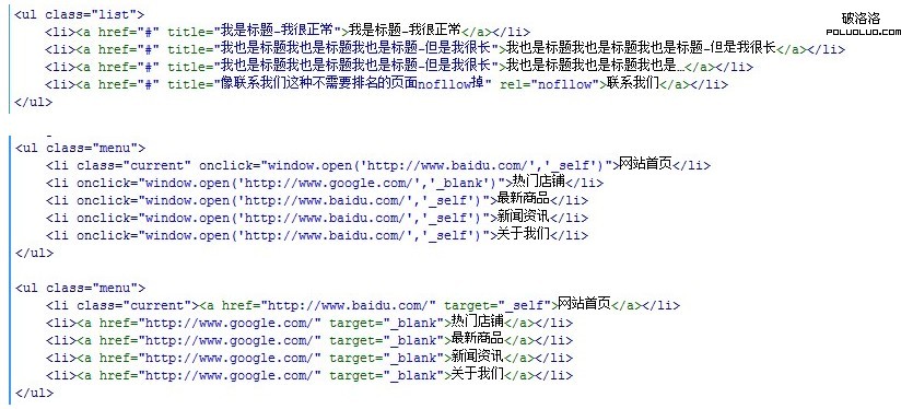 6、鏈接可根據實際需求添加title屬性以及nofllow值;非特殊性鏈接,鏈接地址一定要寫入herf屬性,有些前端開發人員為了省事,直接用div加個click事件當鏈接,在視覺上和使用上確實是實現了鏈接效果,但是做過SEO優化的人員都知道,蜘蛛目前對於js的支持很差,基本無法讀取裡面的鏈接地址。所以說用click事件是絕對不允許的,特別是一些重要的導航鏈接。