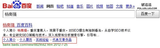 百度百科上進行了逐漸改進以及完善,並且得到廣泛應用,尤其是迷你的sitelink,其中百科中sitelink數據多為目錄結構標題,當百科知識存在多義詞時,sitelink則會豎行展現其它含義。在百度整合搜索過程中,百科已經早已列入到搜索引擎結果頁面中,並且獲得的權重較高,整體排名效果較為理想。