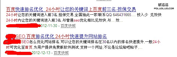 經常也能在一些站長網站和一些群發廣告中發現好多自稱”或24小時SEO優化關鍵詞上百度首頁第一“的文章或廣告,甚至連網站的FTP後台也不需要,還可以試用,三天上首頁等等!