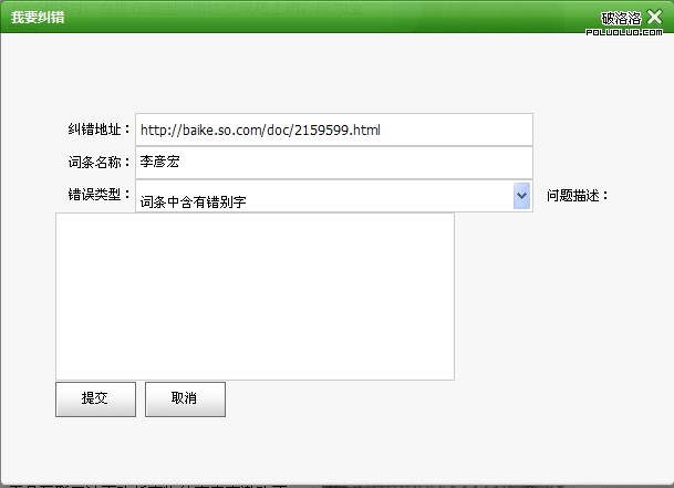 這個“其他資料”占了整個詞條篇幅的一半。類似的細節還有不少,在此不便一一列出。其實360百科之所以還這麼簡陋,一方面是剛剛上線,另一方面是因 為它還沒有把廣大群眾的智慧融入進來,也即是沒有對網民開放,普通網民沒有權限進行編輯,只是與第三方伙伴合作。據說現在編輯的詞條都是由360內部團隊 完成,往後會陸續開放給普通網民參與編輯,但是現在網民可以通過糾錯按鈕把錯誤反饋給360,如圖: