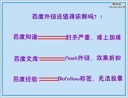 上面說到的三種百度產品的外鏈效果都大不如以前,但是是不是我們就得放棄百度外鏈這條大魚呢?這種消極想法是錯的,百度外鏈的確不能讓我們再依賴了,但是百度還是我們的推廣利器,筆者認為百度外鏈雖難做,但也有技巧: