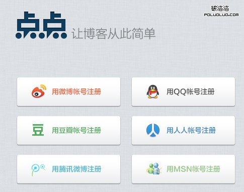 第一步,先申請一個點點博客,打開點點網主頁之後,點擊右上角的注冊,有六個平台可以注冊,新浪微博、騰訊微博、QQ賬號等,都可以選擇,注冊的時候填好郵箱以及域名,域名如果被人注冊的話,那麼就換別的域名即可,比如1234567.diandian.com這種,注冊之後,進入到主頁。