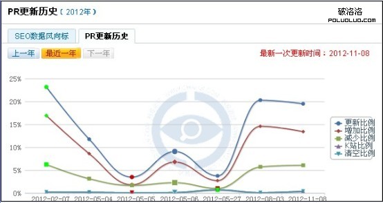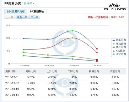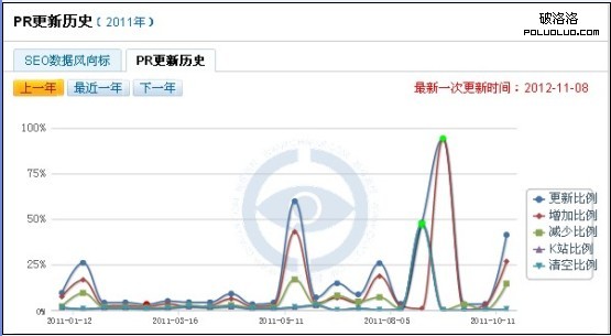 在2011年裡PR值的更新是比較不規律的,從1月份開始一直到11月份都在小幅度更新,除了10月8號的接近百分之百的更新之外,其余的都是小幅度的更新,而且也毫無規律可言。