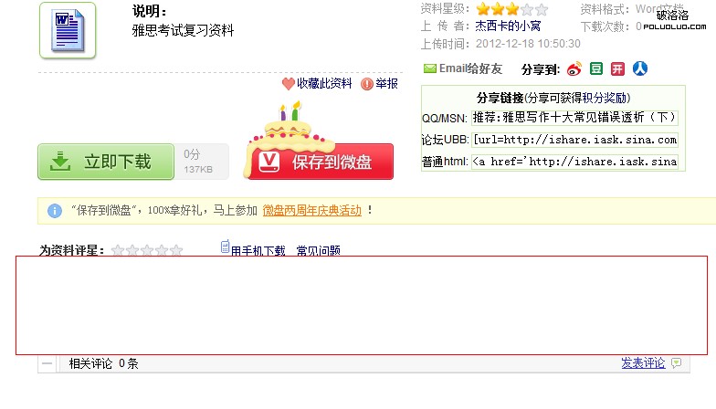 新浪愛問共享資料勉強也算一個文庫平台,不過它支持各種格式,並不限於文檔,這個平台筆者不多說,可見下圖為愛問共享的快照頁面,它的文檔內容百度是不抓取的,所以對於seo外鏈人員來說沒什麼意義,當然或許有什麼另辟蹊徑的辦法,比如在說明中添加鏈接,不過筆者暫時還沒有進行類似的嘗試,這就等著有興趣的各位自己去探索交流了。