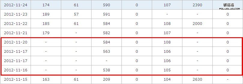 筆者和大家說說我當時是用哪些方法快速恢復被K的網站的,當然筆者用的方法不一定就適合每個被K的網站,歡迎大家指教批評!首先來看下我網站歷史數據截圖吧,很明顯能看到11月16號那幾天各項數據為0。
