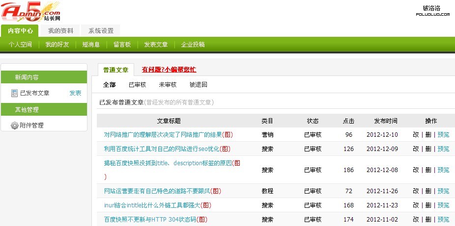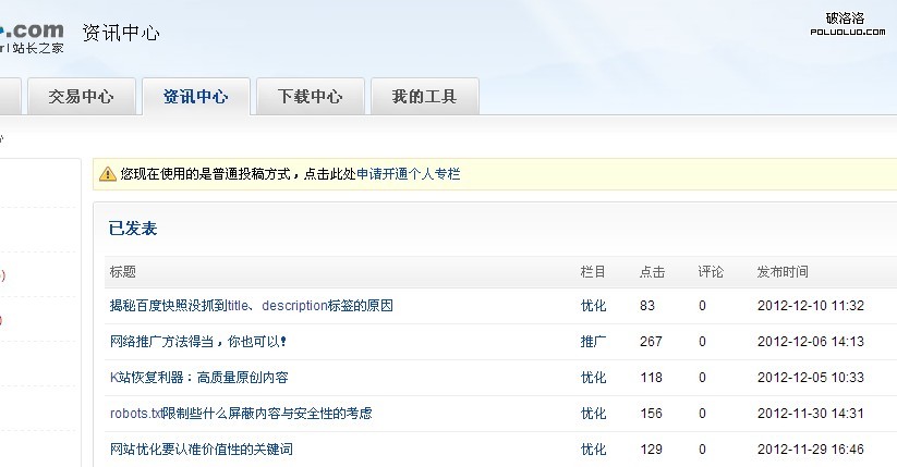 下面就來說說筆者對外鏈方面的做法吧。筆者一般做外鏈就選擇二個地方,第一個:站長網 ,第二個chinaz,筆者每天半個小時的時間實際上也都是花在這二個網站的投稿上面: