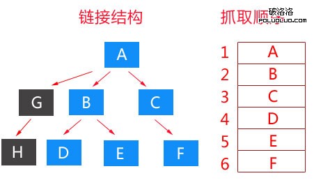 我們都知道,大部分網站都是按照樹狀圖來完成頁面分布的,那麼在一個樹狀圖的鏈接結構中,哪些頁面會被優先抓取呢?為什麼要優先抓取這些頁面呢?寬度優先抓取策略就是按照樹狀圖結構,優先抓取同級鏈接,待同級鏈接抓取完成後,再抓取下一級鏈接。如下圖:
