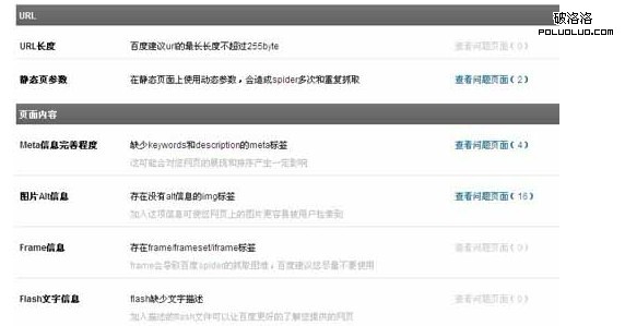 當你的網站嵌入了百度統計的代碼以後,百度統計工具就會自動對您的站點進行分析,分析的內容包括兩大類:第一類是URL長度、靜態頁參數;第二類是Meta信息完善程度、圖片Alt信息、Frame信息、Flash文字信息;筆者博客前期因為圖片Alt信息不完善導致檢測的結果還不及格,雖然這裡只是百度對站長的SEO建議,但是如果你不注意的話,可能會導致你的SOE優化效果沒有預期的那麼好,其實我們SEO就是不斷的查漏補缺和探索發現的一個過程,在探索發現之前應該學會查漏補缺。
