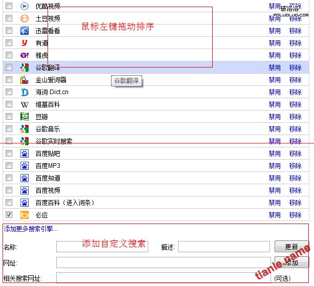 添加、刪除、修改、排序、自定義搜索引擎,如下圖:
