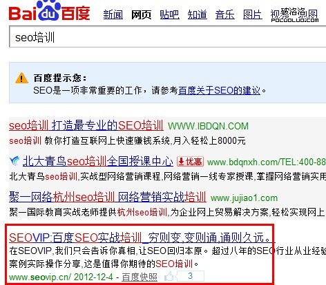 簡單樸實的設置,title=“SEOVIP_百度SEO實戰培訓,讓SEO回歸真相”,百度抓取的為“SEOVIP:百度SEO實戰培訓_窮則變,變則通,通則久遠。”,簡單的對比一下,沒有我們熟悉的堆積關鍵字,沒有我們熟悉的超過多少字的標題,有的僅僅是我們看到的三點“SEOVIP,百度SEO實戰培訓,讓SEO回歸真相”,一段順暢的標題從另一個角度中提到了我們不用關注標題中有多少關鍵字的存在,而應該關鍵字的是SEO的自然融合,帶出了百度seo,seo培訓,seo實戰,等等的關鍵字。