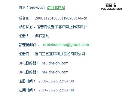從圖上面可以看得出,這個站注冊時間是2006年,距離現在已經有6年的時間了;尤其是看到“點石互動”四個字,更是SEO界的傳奇組合,robin恰恰是點石互動的創始人之一;這個站我以前就注意過,本身原來就是寫SEO相關內容的,而這次重新啟用,寫的也是關於SEO方面的東西。因此這個站繼承了以前的權重,對排名的提升也起到了很多的促進作用;寫到這裡,我想說一句,不要太迷戀老域名,原因以後我會在博客裡面說明的;