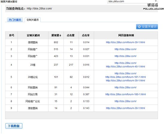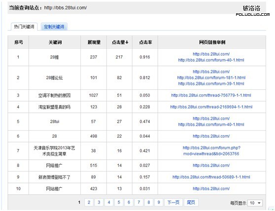 之前老版的關鍵詞搜索查詢工具大家可能比較熟悉了,相對功能比較簡單,只能查看自己網站展現量最高的10個詞的訪問情況。