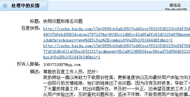 小站在剛剛出現排名和快照波動的時候,因為擔心友情鏈接被站長朋友給撤了,以起更大排名波動,便向百度投訴中心投訴,如圖: