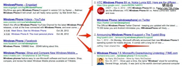 我先關掉了個人化,並搜索了Windows Phone,然後打開個人化,進行了同樣的搜索。結果如下:(左邊的是沒有個人化的結果,右邊的是個人化的)