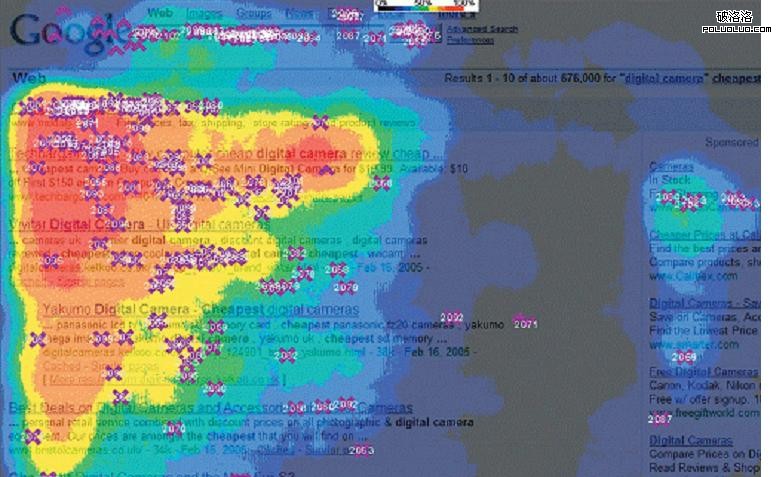 國外曾經有一份關於搜索者對於搜索結果頁面的點擊熱度調查,調查的結果如下圖所示。