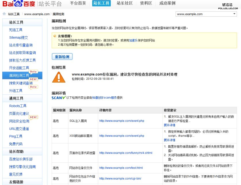 百度官方在11月15日公布了漏洞檢測工具beta版,這個工具可以檢測網站是否被黑客攻擊,是否有漏洞。因為百度風險提示主要是因為網站被黑客攻擊和網站本身的漏洞。那麼該如何使用漏洞檢測工具呢?