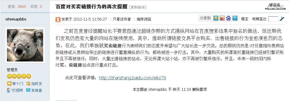 作為SEOer我們都很清楚友鏈在站點的優化中有著關鍵的作用。而有的人就把小聰明動到這個地方,購買或者出售友鏈,造成友鏈的不協調。這裡所說的不協調的友鏈我們可以概括為兩個方面:一是兩個交換鏈接的站點權重相差不協調,另一個是友情鏈接導出數量和導入數量的不協調。比如一個權重很高的站點友鏈指向一個權重極低的新站,或者是一個站點的導入鏈接嚴重高於到處鏈接。這兩種現象都很有可能被搜索引擎認為是購買了友情鏈接,鏈接工廠等不正規的競爭行為,聰明反被聰明誤,這種操作將可能為站點帶來毀滅性的危害。百度近期就更新了一個相關的算法來針對友鏈的不協調。如下圖百度站長社區的公告所示: