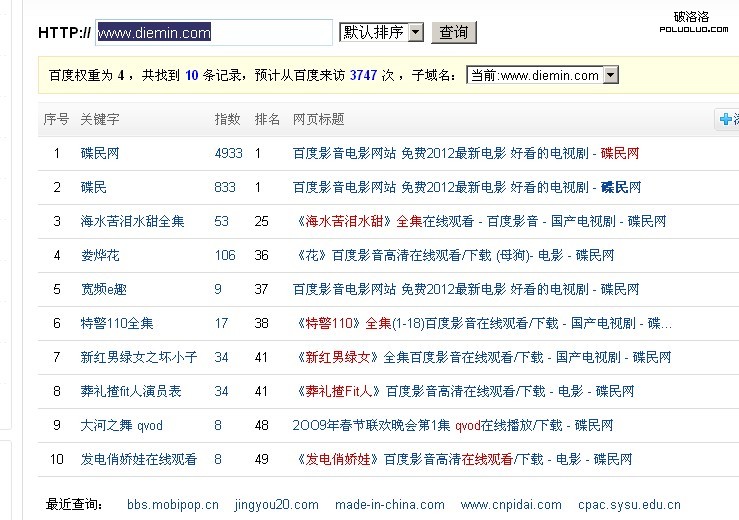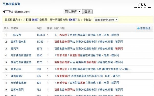 由於黑鏈效果快且價格比購買友鏈來的低廉,為此吸引了一大批站長,但是使用這種方式無異於自焚。上文筆者提到的關於百度針對購買外鏈做的算法更新同樣適用於黑鏈。近來就有一個很明顯的例子。這是一家名為“碟民網”的電影網站,在10月24日我們通過站長工具查詢該網站的百度權重值有8,而網站日訪問量估算約在50萬IP左右。如下圖所示