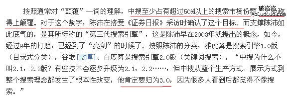 中搜的ceo名叫陳沛,可能他的名字沒有現在的李彥宏和周鴻祎這麼響亮,但是他在業界被稱為“中國搜索引擎之父”,前兩位在他面前都還稍顯稚嫩。在最近對記者透露了他對中搜搜索引擎的看法,我從那片報道中截取了幾張圖,那氣勢真令人目瞪口呆:
