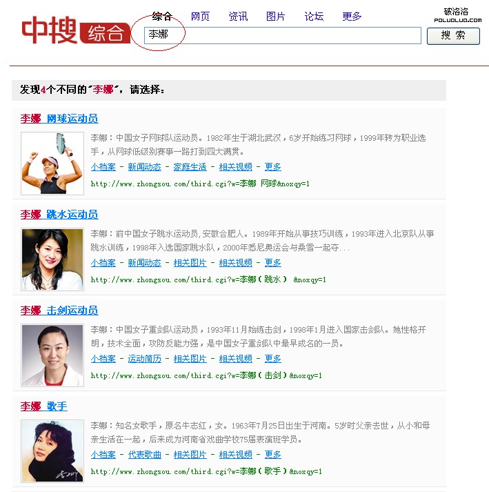 舉個例子:當你在搜索框中輸入“李娜”兩個字時,一般想搜的可能是網球運動員李娜、游泳運動員李娜、擊劍運動員李娜和歌手李娜,因為只有這幾個結果才是用戶比較關注的,第三代搜索居然可以考慮到這些可能性,在搜索結果中把這些信息整理出來,如圖: