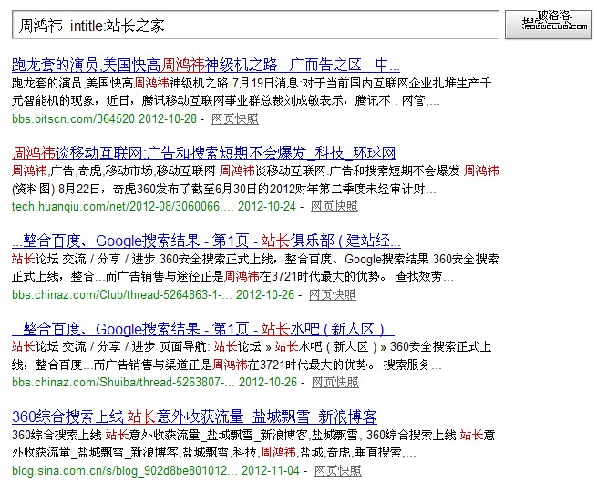 我們最後來看一個常用的指令intitle,這也是搜索引擎普遍通用的指令,表示搜索標題中包含關鍵詞的頁面。看看360的效果: