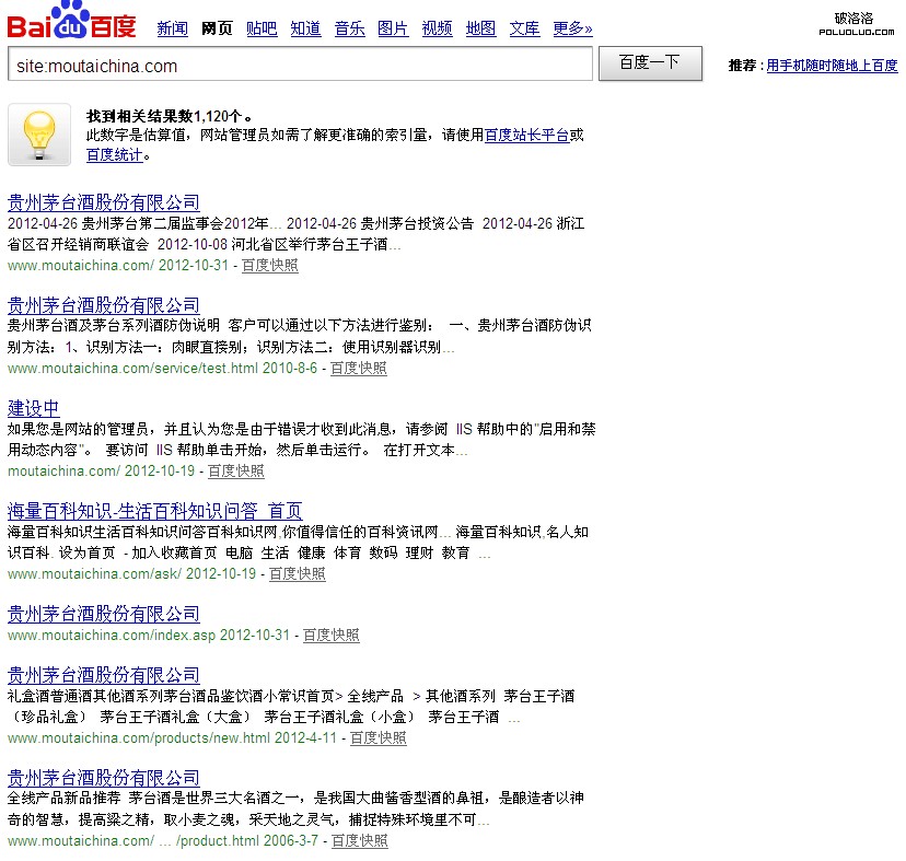 1.品牌站點,比如茅台集團的站點大家看看收錄,我截個圖: