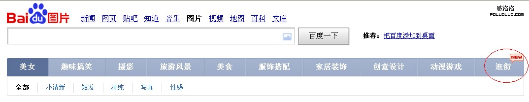 首先看看從圖片導航點擊進入的會界面會煥然一新,首先會看到一個清晰的導航菜單,而且加入了一個百度的“逛街”欄目: