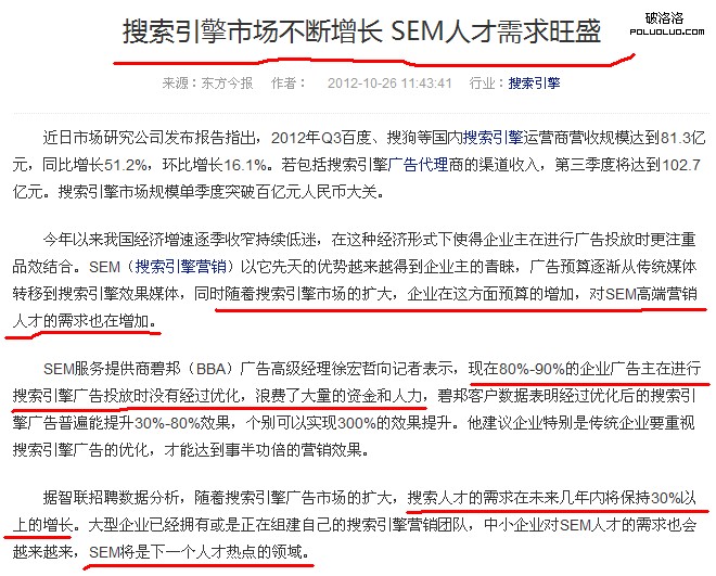 這是從艾瑞網上的一篇關於sem人才需求的文章。從這篇文章看來,如今sem人才還是出現短缺的,遠遠不能填滿百度這個如此龐大的營銷市場。百度營銷大學的出現可以在一定程度上迎合這種需求,讓更多的人可以了解搜索營銷,從而讓更多的企業加入進來。