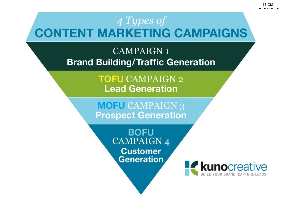 這篇“Content Marketing Is Not As Simple As Writing A Ton of Blog Posts Every Day ”也說,內容行銷不是每天產生很多內容而已,而是必須思考sales funnel (銷售漏斗),也就是如何讓內容層層的縮小范圍,引導消費者進到完成訂單。