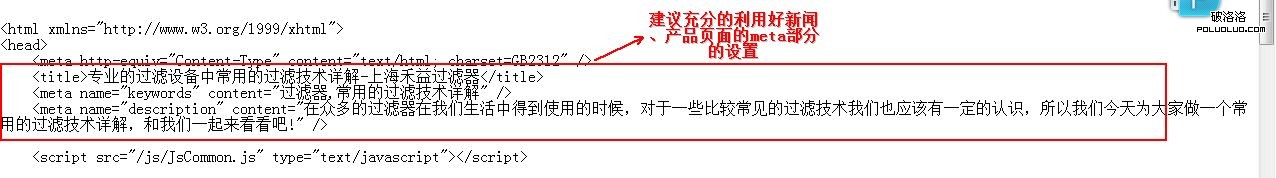 詳細頁面主要是指,新聞、產品的具體的詳細頁面,談到詳細頁面的關鍵詞布局,首先說下詳細頁的標題設置,詳細頁的標題通常采用h2,h3標簽,在標題中可以適當的放入關鍵詞來進行優化。當然每一篇文章也都有meta部分,例如一篇過濾器的文章,title:中可以布局關鍵詞,Keywords:中布局長尾關鍵詞,Description中設置含有關鍵詞的描述性信息。