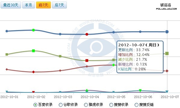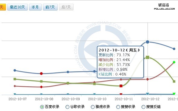 再來分析下最近一個月的K站比例,為了方便查看,我把其他幾個網站數據指標隱藏了。從2012年9月14日至2012年10月9日,差不到就是一個月的數 據,可以看到幾個最高點的波峰,居然都是星期六,真是站長們的黑色星期六,為什麼百度新算法要在星期六下狠手呢?個人猜測:星期六是百度一周大更新後的第 一天(或者是第二天),經過新算法的一周的測驗基本已經確定了哪些站點該被K,也就是算法在進一步的核實,那些明顯的垃圾站活不到周六,剩余下來的被放入 黑名單的站點,這次最終被確定了,誤加入黑名單的站點被放走,剩下的全部搞死。