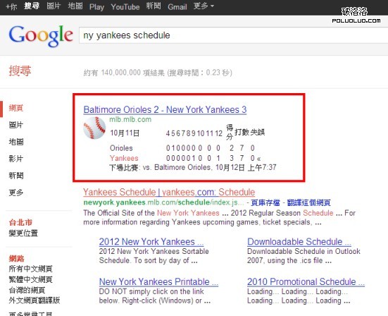 如下圖,我們輸入“ny yankee schedule”進行搜索。搜索引擎直接列出洋基球隊的行程表,這個結果就是我們需要的,其他的SERP根本是多余的。