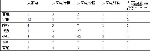 從上表中咱們可以看出,除了“大家電”以外,其他長尾詞的排名都是非常好的,當然並不是說“大家電”這詞排名就差了,百度“大家電”排名第一的是京東另一個頁面,也是屬於京東的,當然咱們這裡分析的是單獨頁面而不是整站,所以這就不多說了。